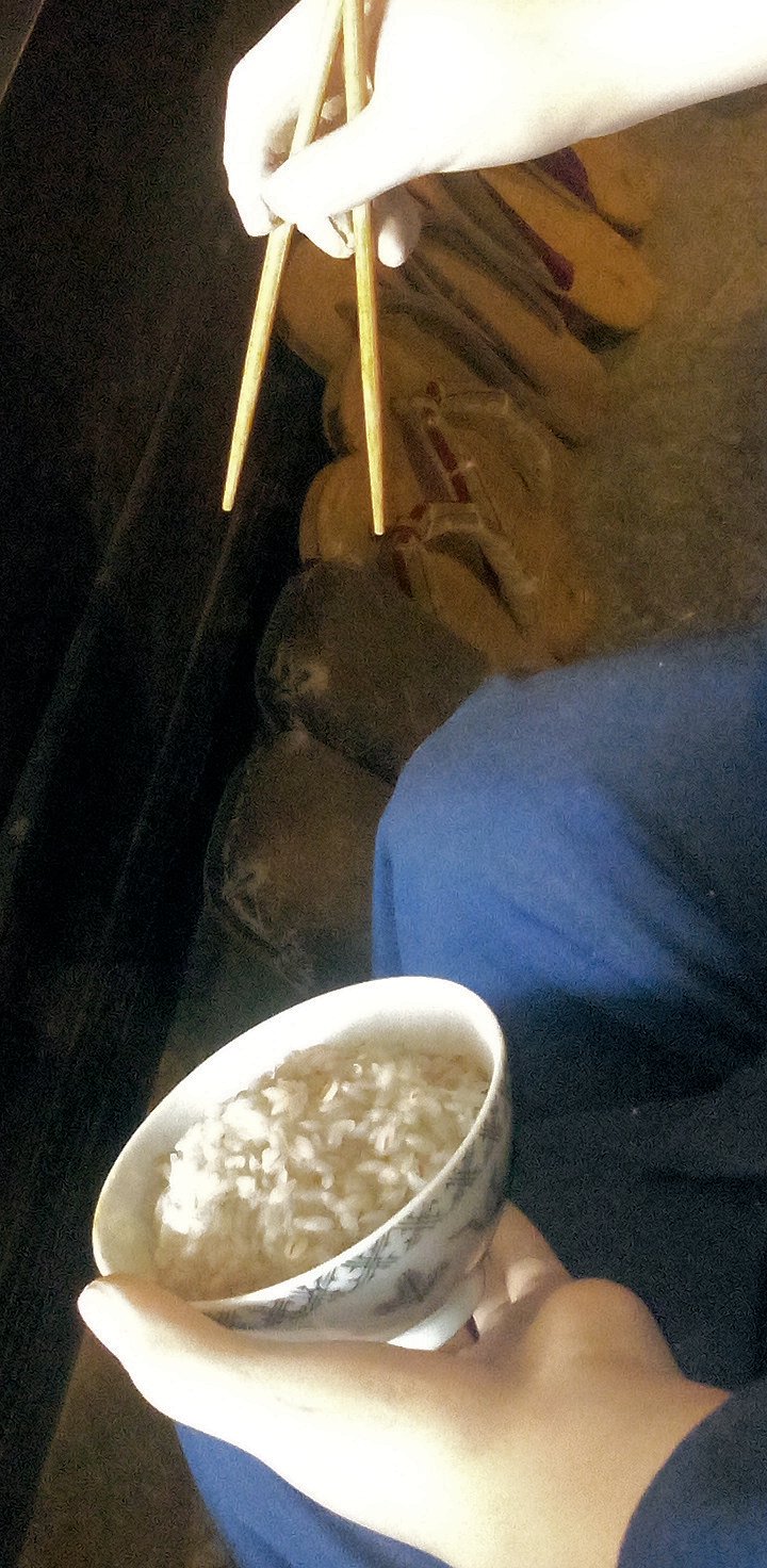 家族は白米を食べ、
